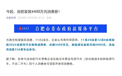 11月29日,,,,,,据合肥宣布公众号显示,,,,,,克日(11月29日)起至12月8日时代,,,,,,将发放2024合肥市汽车新购消耗券,,,,,,总额4400万元,,,,,,新能源车最高可减6000元,,,,,,运动共征集336家车企加入。。。。。。。图片泉源:合肥宣布据相识,,,,,,在加入运动的汽车零售企业处购... 11月29日,,,,,,据合肥宣布公众号显示,,,,,,克日(11月29日)起至12月8日时代,,,,,,将发放2024合肥市汽车新购消耗券,,,,,,总额4400万元,,,,,,新能源车最高可减6000元,,,,,,运动共征集336家车企加入。。。。。。。图片泉源:合肥宣布据相识,,,,,,在加入运动的汽车零售企业处购...