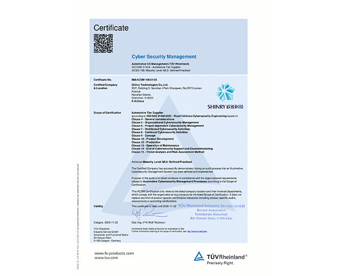 ISO/SAE 21434 汽车网络清静管理ML 3证书(2023年)